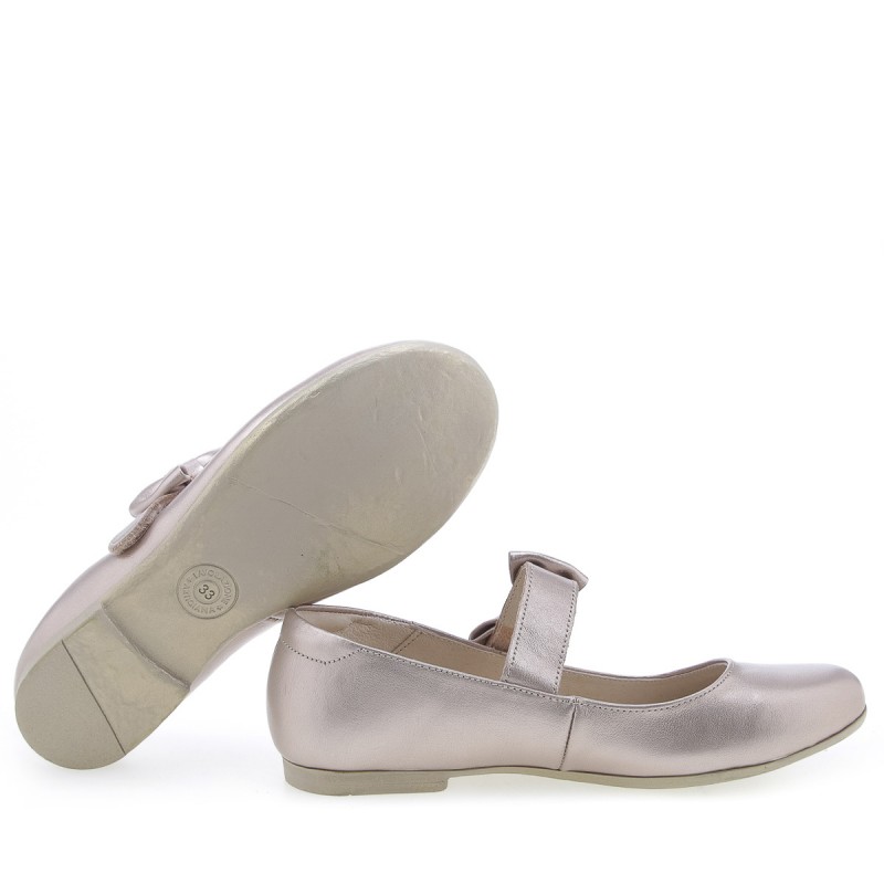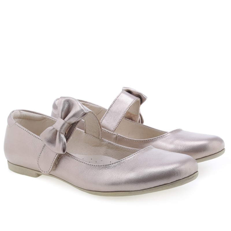 Prezentowany model na zdjęciu w całości wykonany jest z miękkiej skóry naturalnej w nieprzesadzonym złotym kolorze. Uwagę przykuwa szykowna kokarda trwale umieszczona na pasku. To właśnie kokarda jest jedynym zdobieniem buta. Wyjątkowo miękkie materiały powodują, że buty są niezwykle wygodne w użyciu - idealnie dopasowują się do kształtu stopy, zapewniając znakomitą wentylację i nie powodują otarć ani odcisków. Buty regulowane są za pomocą rzepu, dzięki któremu są łatwe do samodzielnego zakładania i zdejmowania Podeszwa z jest bardzo elastyczna. Ten model bucika sprawi, ze każda wyjątkowa chwila zostanie na długo w pamięci młodej damy.