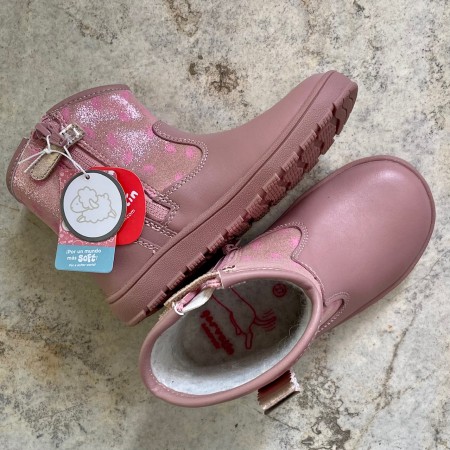 Buty wykonane są z naturalnej skóry, co zapewnia oddychalność i trwałość, a miękka i ciepła wyściółka wykonana z naturalnej wełny oraz pkryta wełna wyjmowana wkładka gwarantują wygodę i komfort termiczny podczas codziennych aktywności. Zapięcie na suwak ułatwia szybkie zakładanie.