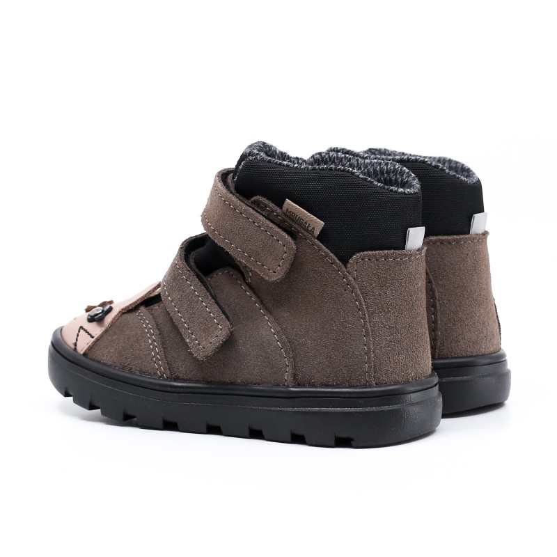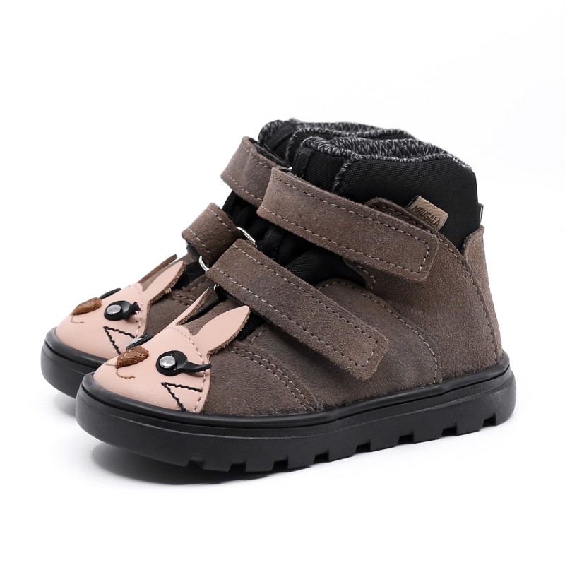 Dziecięce trzewiki Mrugała Andy Bunny Grey to połączenie komfortu, trwałości i uroczego designu. Wykonane z naturalnej skóry welurowej z hydrofobową powłoką, wyposażone w membranę "te-por" oraz ocieplaną wkładkę, gwarantują ciepło i suchość nawet podczas jesienno-zimowych spacerów. Antypoślizgowa podeszwa TR