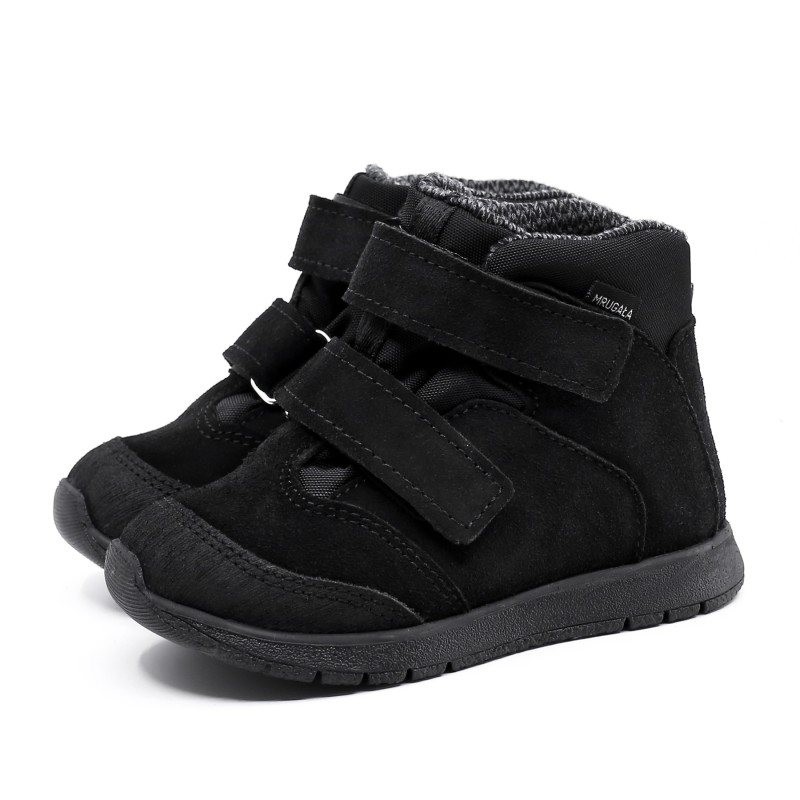 Dziecięce trzewiki Mrugała JOGI BLAK - komfort, trwałość i design. Wykonane z naturalnej skóry welurowej z hydrofobową powłoką, wyposażone w membranę "te-por" oraz ocieplaną wkładkę, gwarantują ciepło i suchość nawet podczas jesienno-zimowych spacerów. Antypoślizgowa podeszwa TR i podwójne rzepy zapewniają bezpieczeństwo i wygodę noszenia. Idealne na chłodne dni od –5°C do +15°C.