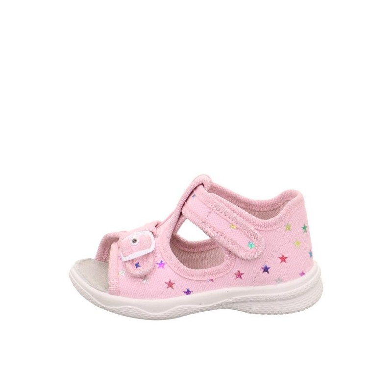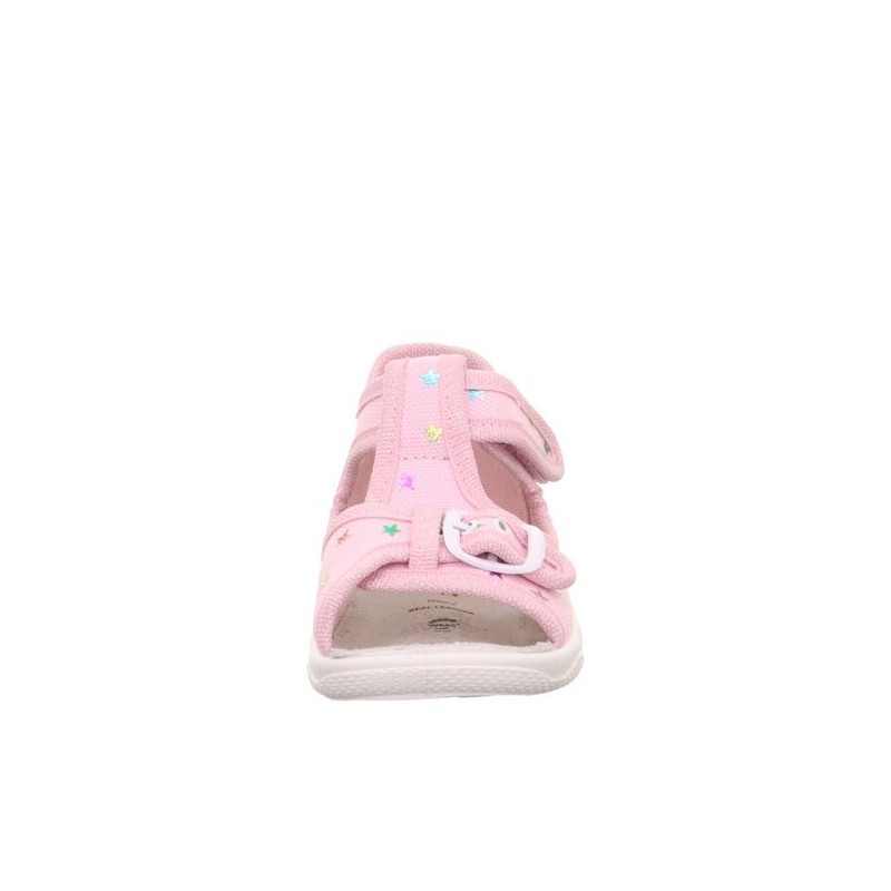 Sandały Superfit Polly ekstra lekkie z bardzo elastyczną, piankową podeszwą oraz wyższym, wzmocnionym zapiętkiem. Idealne do nauki i doskonalenia chodzenia, nie blokują nauki przetaczania stopy. Sandałki wykonane są z trwałej tkaniny bawełnianej i skórzanej wkładki. Przedni pasek można swobodnie dopasować do szerokości małej stopy dzięki widocznej klamerce, którą wystarczy dopasować, bez konieczności każdorazowego zapinania. Podeszwa jest płaska, ma delikatny bieżnik, w części pod palcami uniesiona lekko do góry. Nasi Klienci wybierają ten model jako kapcie do żłobka, do przedszkola i do letnich spacerów. Są tak lekkie, jakby stopa chodziła na boso.