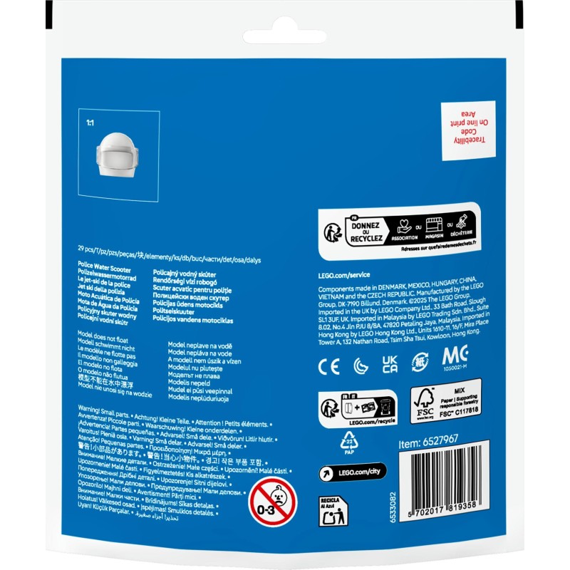 Przemierzaj fale podczas rejsu patrolowego Policyjnym skuterem wodnym LEGO® City. W zestawie znajduje się minifigurka policjanta, a także kamizelka ratunkowa, kask i kajdanki.