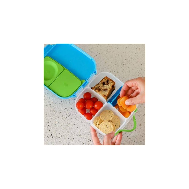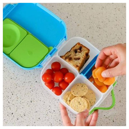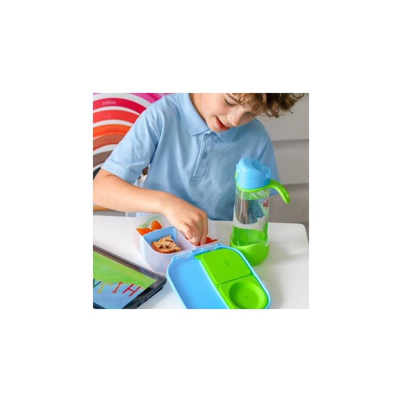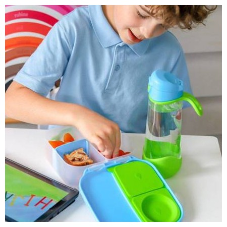 Mini lunchbox b.box jest zgrabny i poręczny. Dziecko może wygodnie trzymać go w dłoni dzięki zintegrowanemu uchwytowi ale także, może wsunąć go do plecaka lub torby. W sam raz do szkoły, gdy jest mniej lekcji lub na krótką wycieczkę i dłuższy spacer.
