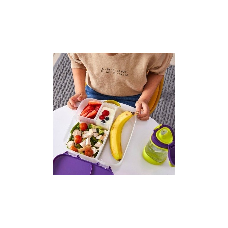 Pudełko śniadaniowe z poręcznym uchwytem skrywa w sobie małe i duże przegrody, dzięki którym zapakujesz dziecku do szkoły lub na wycieczkę jego ulubione potrawy i przekąski. Lunchbox b.box ma kilka sprytnych rozwiązań. Ruchome przegrody, które można przestawiać lub wyjąć by zmieścić w pudełku całego banana lub jabłko. Dużą kwadratową przegrodę w sam raz na apetyczny makaron z warzywami lub kanapki. Ta przegroda ma praktyczny "patent". Podwójne dno, pod które możesz schować dołączony do zestawu wkład chłodzący. Dzięki niemu produkt w przegrodzie dłużej pozostanie chłodny i świeży. Rozwiązanie idealne szczególnie gdy za oknem słońce i wysokie temperatury. Silikonowa uszczelka przykrywająca mniejsze przegródki umożliwi przenoszenie w nich miękkich soczystych owoców, jogurtu lub dipu do warzyw. Jednym słowem, przygotowując dziecku drugie śniadanie, lunch czy prowiant na wycieczkę nie musisz rezygnować z różnorodności i właściwego zbilansowania posiłku.