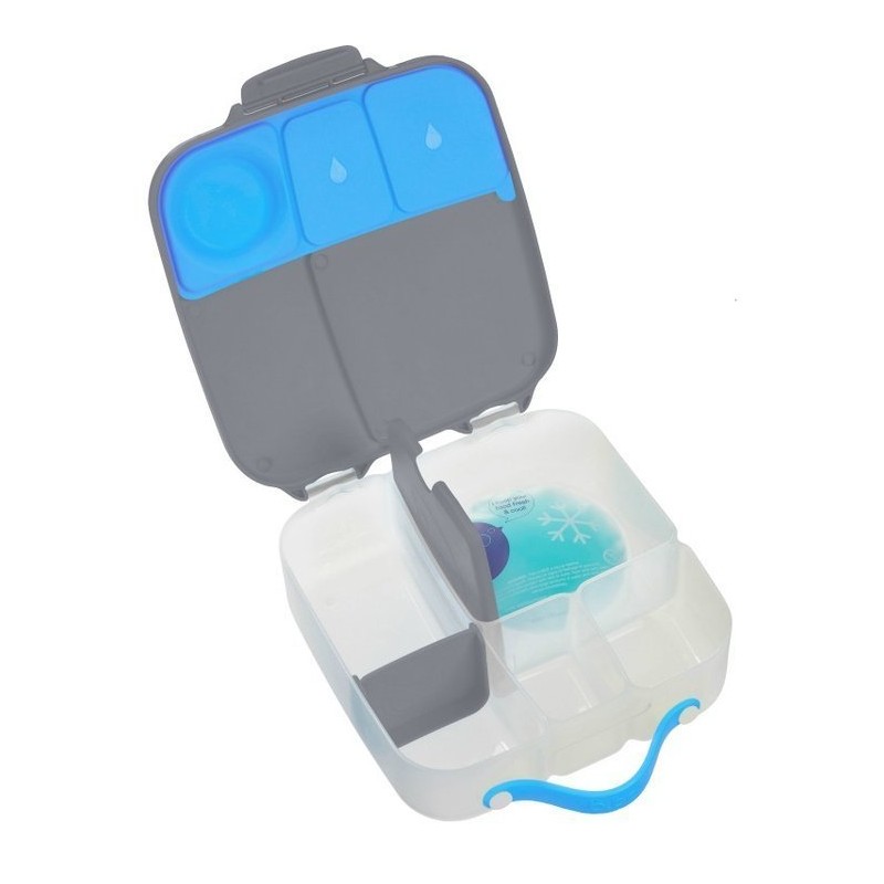 Pudełko śniadaniowe z poręcznym uchwytem skrywa w sobie małe i duże przegrody, dzięki którym zapakujesz dziecku do szkoły lub na wycieczkę jego ulubione potrawy i przekąski. Lunchbox b.box ma kilka sprytnych rozwiązań. Ruchome przegrody, które można przestawiać lub wyjąć by zmieścić w pudełku całego banana lub jabłko. Dużą kwadratową przegrodę w sam raz na apetyczny makaron z warzywami lub kanapki. Ta przegroda ma praktyczny "patent". Podwójne dno, pod które możesz schować dołączony do zestawu wkład chłodzący. Dzięki niemu produkt w przegrodzie dłużej pozostanie chłodny i świeży. Rozwiązanie idealne szczególnie gdy za oknem słońce i wysokie temperatury. Silikonowa uszczelka przykrywająca mniejsze przegródki umożliwi przenoszenie w nich miękkich soczystych owoców, jogurtu lub dipu do warzyw. Jednym słowem, przygotowując dziecku drugie śniadanie, lunch czy prowiant na wycieczkę nie musisz rezygnować z różnorodności i właściwego zbilansowania posiłku.