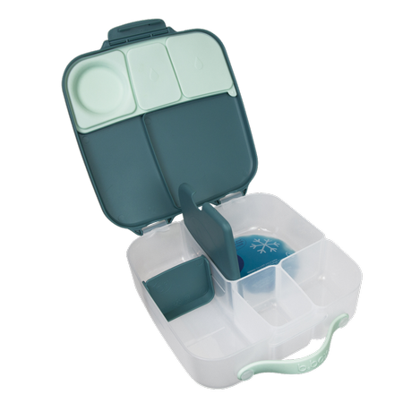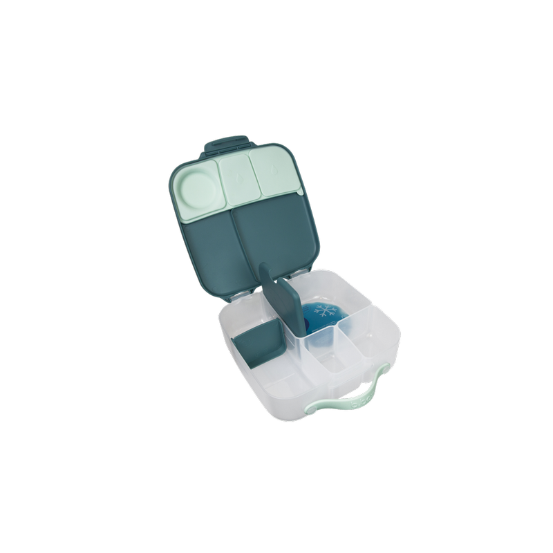 Pudełko śniadaniowe z poręcznym uchwytem skrywa w sobie małe i duże przegrody, dzięki którym zapakujesz dziecku do szkoły lub na wycieczkę jego ulubione potrawy i przekąski. Lunchbox b.box ma kilka sprytnych rozwiązań. Ruchome przegrody, które można przestawiać lub wyjąć by zmieścić w pudełku całego banana lub jabłko. Dużą kwadratową przegrodę w sam raz na apetyczny makaron z warzywami lub kanapki. Ta przegroda ma praktyczny "patent". Podwójne dno, pod które możesz schować dołączony do zestawu wkład chłodzący. Dzięki niemu produkt w przegrodzie dłużej pozostanie chłodny i świeży. Rozwiązanie idealne szczególnie gdy za oknem słońce i wysokie temperatury. Silikonowa uszczelka przykrywająca mniejsze przegródki umożliwi przenoszenie w nich miękkich soczystych owoców, jogurtu lub dipu do warzyw. Jednym słowem, przygotowując dziecku drugie śniadanie, lunch czy prowiant na wycieczkę nie musisz rezygnować z różnorodności i właściwego zbilansowania posiłku.