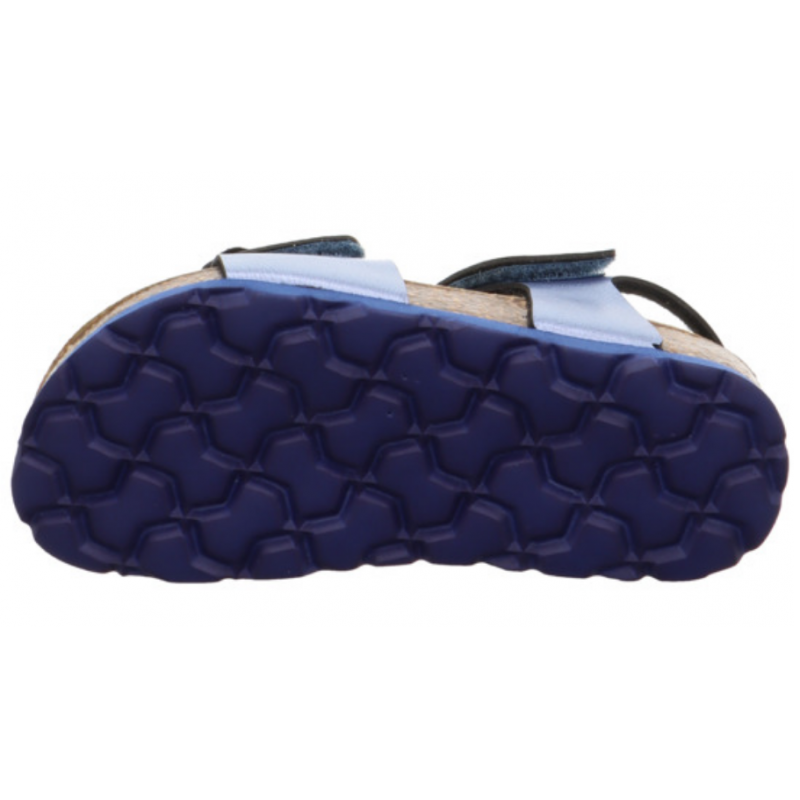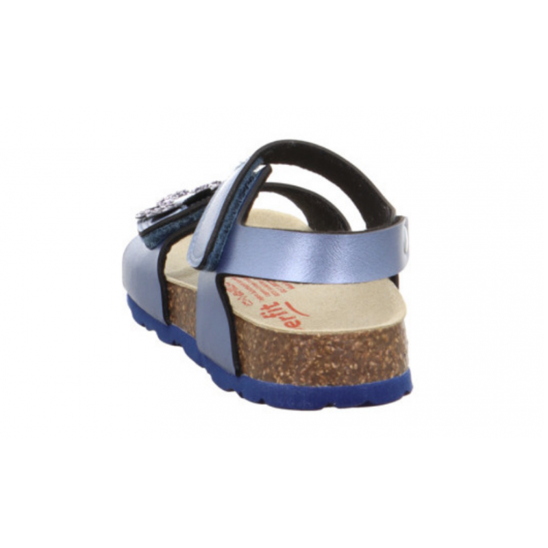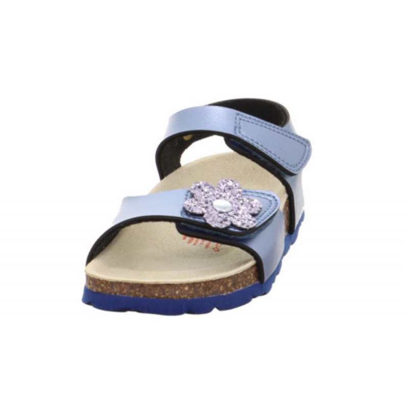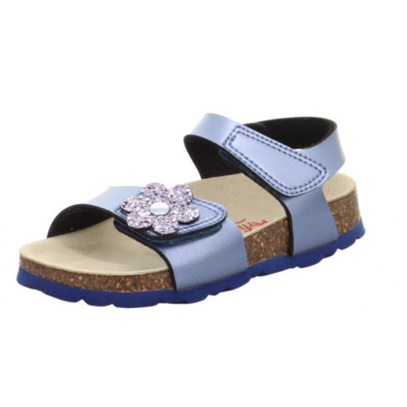 Sandały w typie Fussbeta nie boją się kolorów. Piękny odcień koloru niebieskiego, delikatnie perłowo połyskujący, magiczny, szerszy pasek przy paluszkach ozdobiony błyszczącym kwiatkiem, to propozycja butów na lato dla szerszej dziewczęcej stopy. Paski wykonane są z trwałego tworzywa, które od wewnętrznej strony jest miękkie i delikatne, aby nie obcierać stopy w upalne dni. Wkładka pokryta jest skórą, profilowana, doskonale poprawia ustawienie pięty borykającej się z problemem koślawości. Pod wkładką korek naturalny. Podeszwa jest antypoślizgowa, dzieci mogą biegać bez obaw o niekontrolowaną wywrotkę. Regulacja szerokości za pomocą rzepów.