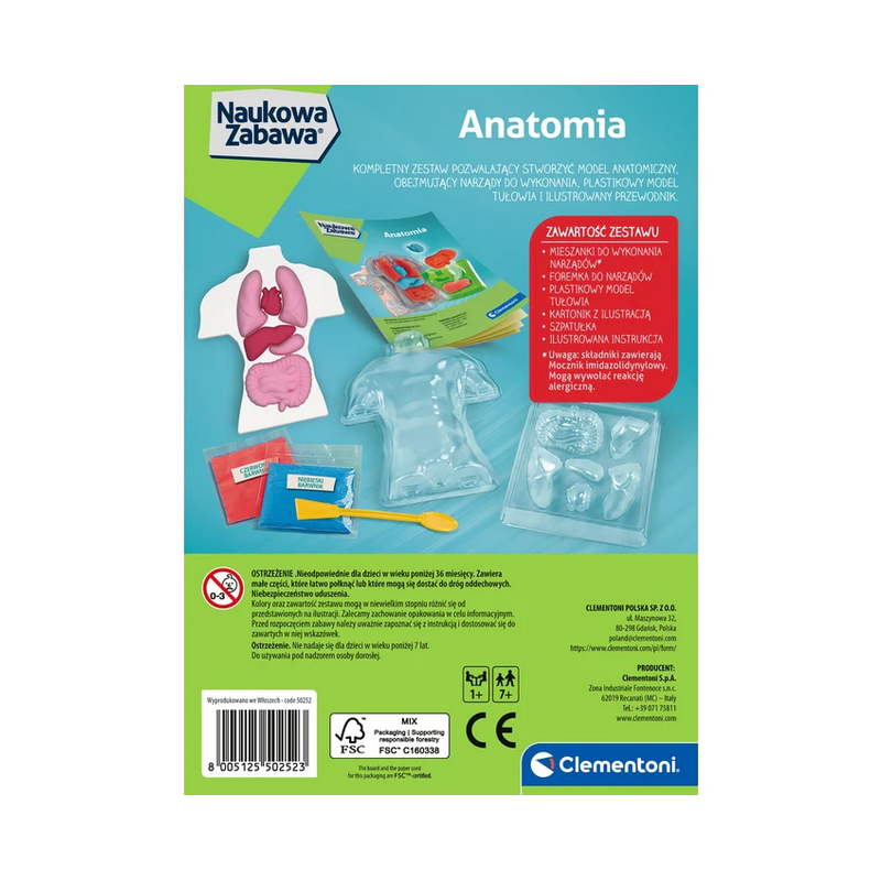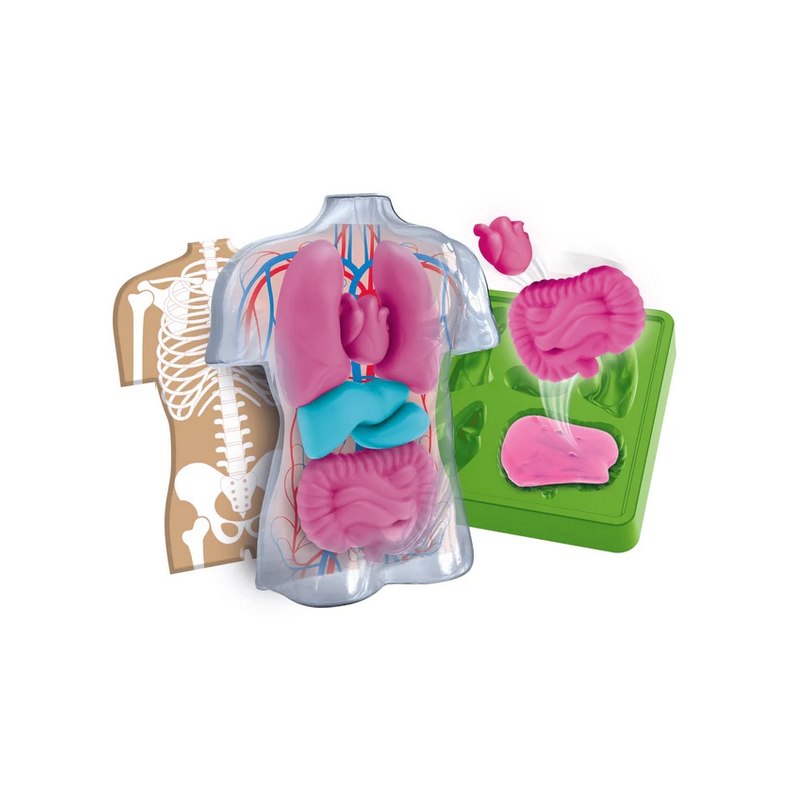Za pomocą kolorowych mieszanek i specjalnych foremek dziecko może wykonać własne modele narządów w formie miękkich „gniotków”, a następnie umieścić je w plastikowym modelu tułowia, poznając ich położenie i funkcje.