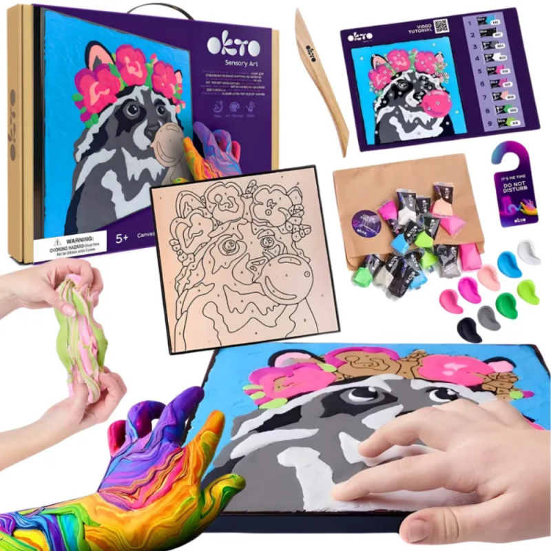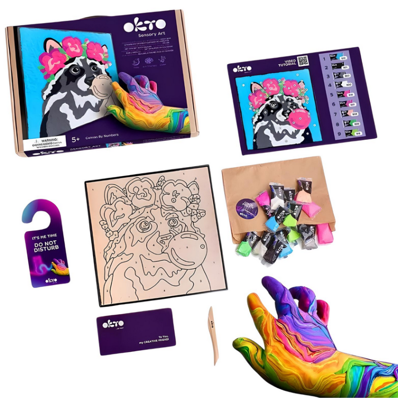 Odkryj kreatywną zabawę z zestawem OKTO Sensory Art – SZOP! To wyjątkowa kolorowanka po numerach, w której dziecko używa miękkiej, elastycznej masy plastycznej, tworząc efekt wypukłego obrazu 3D. Zmysłowe ugniatanie masy, intensywne kolory oraz gotowy obrazek sympatycznego szopa w kwiatowej opasce sprawiają, że to zabawa, która angażuje wzrok, dotyk i wyobraźnię.
