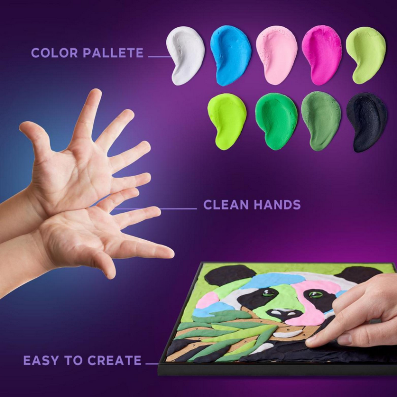Zestaw idealny dla dzieci 5+, rozwija precyzję ruchów, wzmacnia motorykę małą i angażuje zmysły. Rozciąganie i rozprowadzanie masy działa kojąco i wspiera integrację sensoryczną. Gotowy obraz pandy z bambusem wygląda jak mini dzieło sztuki — można go powiesić w pokoju lub podarować jako własnoręcznie wykonany prezent.