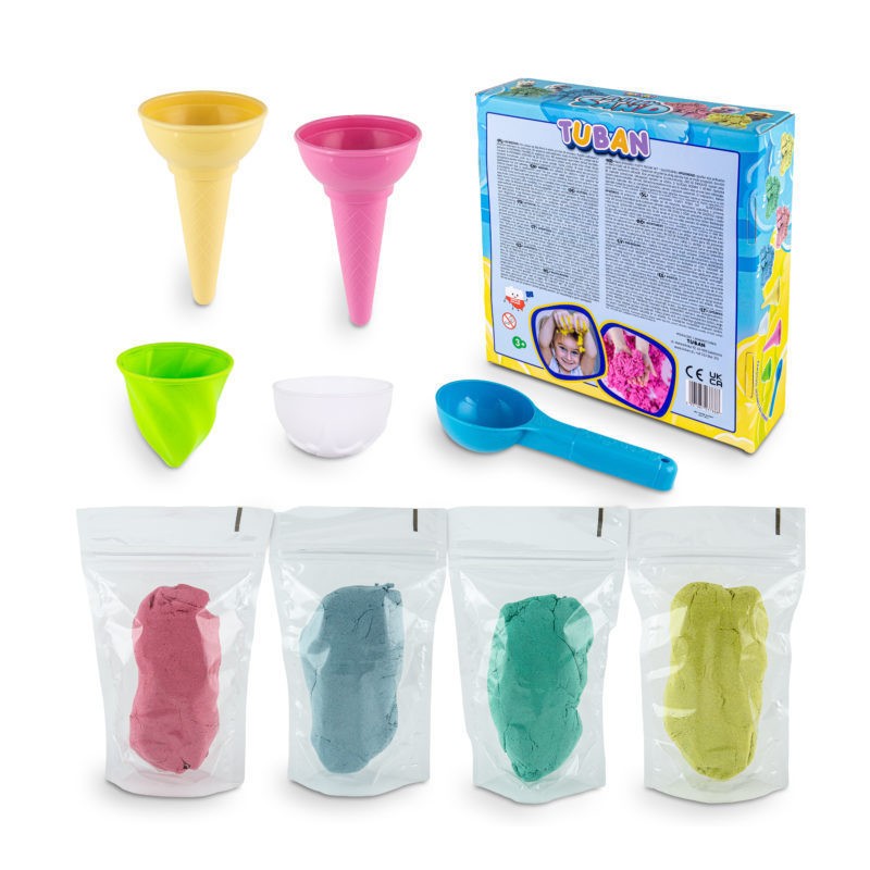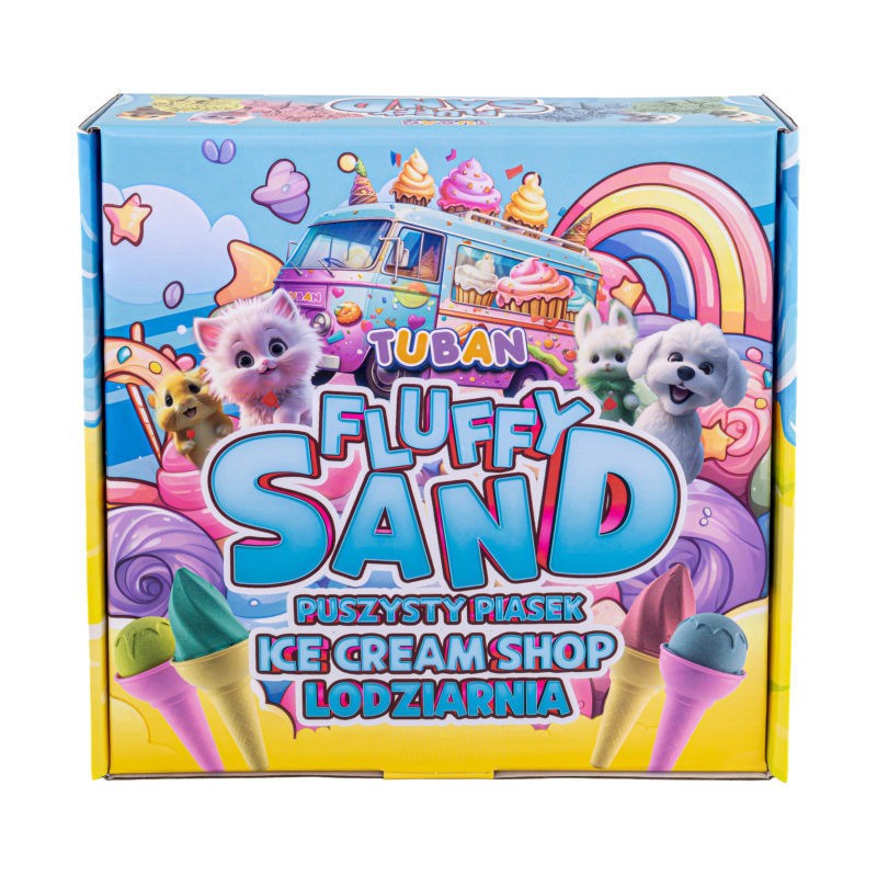 Przenieś się do kolorowego świata słodkich deserów z wyjątkowym zestawem TUBAN Fluffy Sand Lodziarnia. Cztery intensywne kolory niezwykle miękkiego, lekkiego i przyjemnego w dotyku piasku, który pachnie gumą balonową, pozwola uformować gałki lodów, desery i inne kreatywne kompozycje.